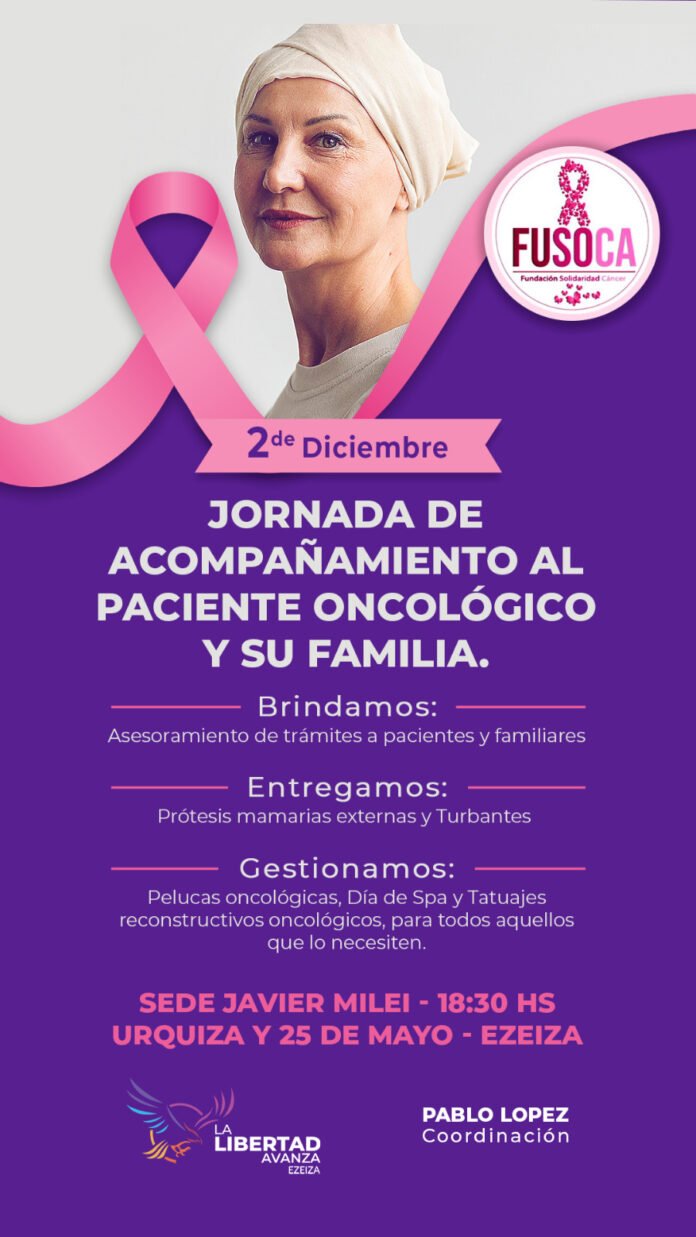 La Fundación Solidaridad Cáncer (FUSOCA) organiza este martes 2 de diciembre una jornada de acompañamiento destinada a pacientes con cáncer y sus familias. El encuentro será a las 18:30 en la sede Javier Milei, ubicada en Urquiza y 25 de Mayo, Ezeiza.