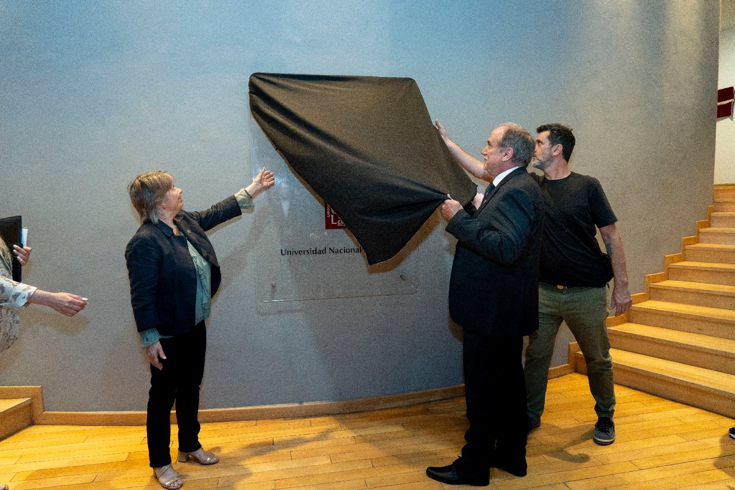 El acto se llevó a cabo en el hall de acceso al Aula Magna, donde el actual rector Daniel Bozzani descubrió la placa con la nueva denominación del espacio, que hasta ahora se llamaba Aula Magna “Bicentenario”, ubicada en el edificio José Hernández.