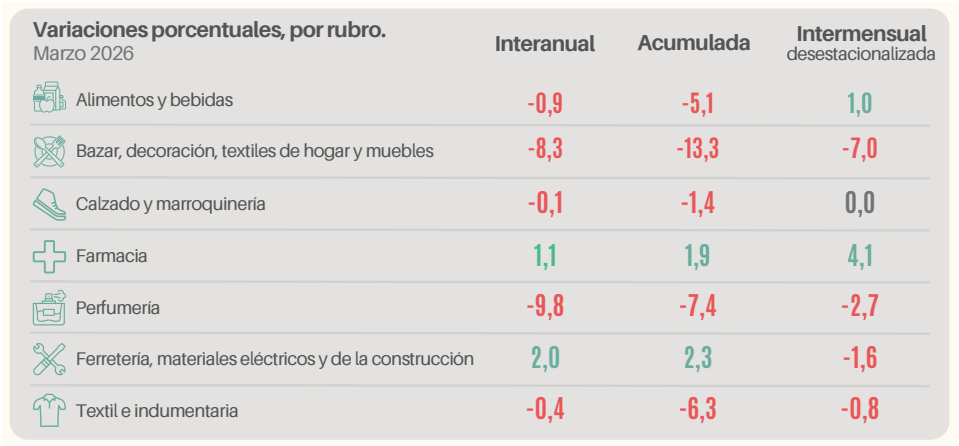 El informe destaca que cinco de los siete rubros relevados mostraron caídas interanuales. El sector más golpeado fue el de Perfumería (-9,8%), seguido por Bazar, decoración y textiles de hogar (-8,3%). En estos casos, la postergación de consumos no esenciales es evidente ante la prioridad que los hogares le dan a la canasta básica.