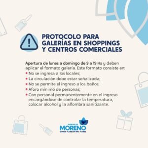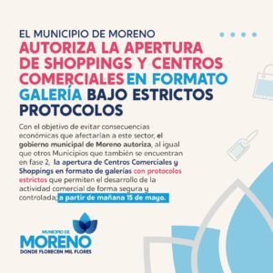 Con el objetivo de evitar consecuencias económicas que afectarían a este sector, el gobierno municipal de Moreno autorizó, al igual que otros Municipios que también se encuentran en fase 2, la apertura de Centros Comerciales y Shoppings en formato de galerías con protocolos estrictos que permiten el desarrollo de la actividad comercial de forma segura y controlada; desde hoy.