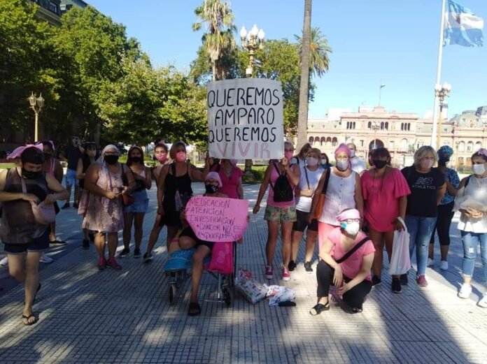 Identificados con pañuelos rosa -y pese a la continuidad de la pandemia de Covid-19-, un centenar de familiares y pacientes oncológicos se organizaron a través de redes sociales para salir a la calle a protestar y reclamar, hacerse ver y buscar que se sepa que sufren la falta de medicación y una «infinita burocracia» para la atención, y para que el Estado posibilite la continuidad y concreción de tratamientos, pese que en nuestro país existe una ley de protección para quienes sufren cáncer, de la que aseguran, no se está cumpliendo.