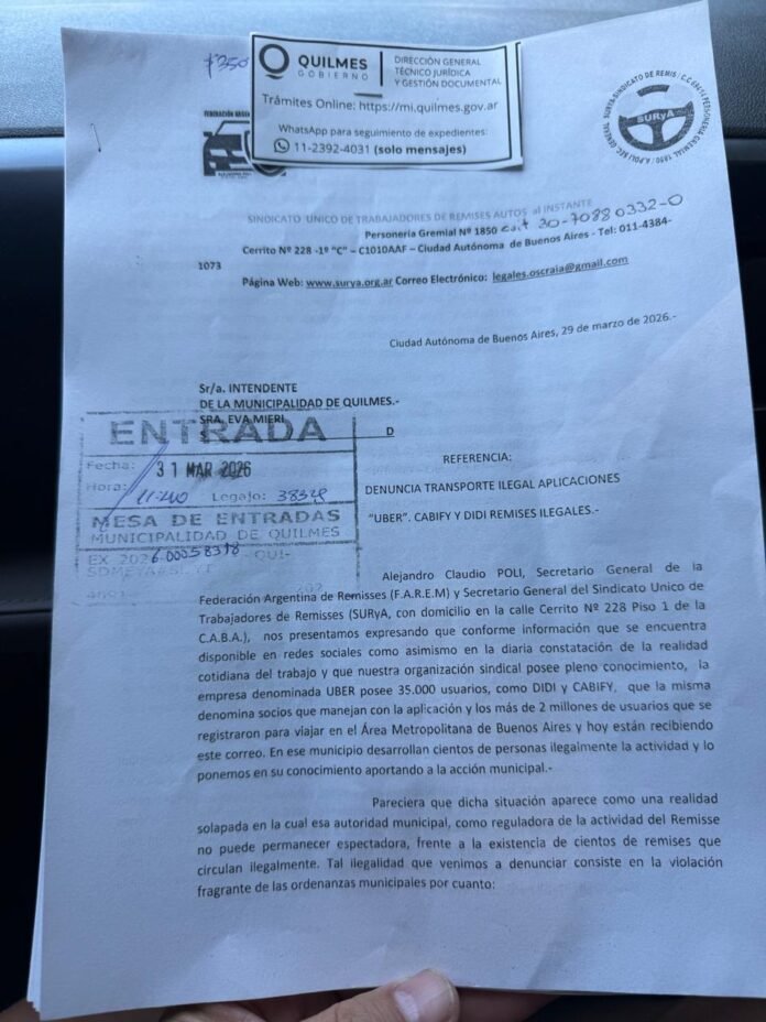 En un nuevo capítulo de la histórica puja entre el transporte formal y las aplicaciones tecnológicas, la Federación Argentina de Remisses (F.A.R.E.M.), junto con el Sindicato Único de Trabajadores de Remisses (SURyA), formalizó una denuncia ante el Municipio de Quilmes por el funcionamiento de servicios de transporte ilegales.