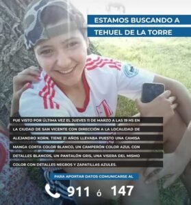 Tehuel De La Torre es una joven de 21 años de quien no se sabe nada desde el jueves 11 de marzo. Se perdió el rastro cuando se dirigía a un evento laboral en Alejandro Korn y nunca regresó.