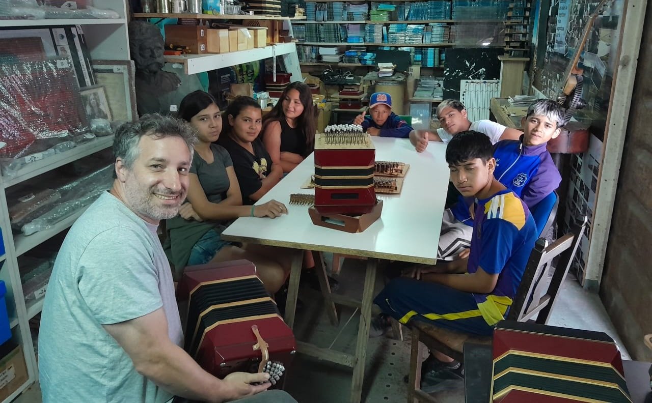 “El objetivo principal es mostrarles a los chicos que el bandoneón no es algo imposible o inaccesible”, explicó Humar durante la clase. “Hay como un mito de que es redifícil de hacer, y lo que buscamos es romper con eso y que puedan tener una primera experiencia real con el instrumento”, señaló.