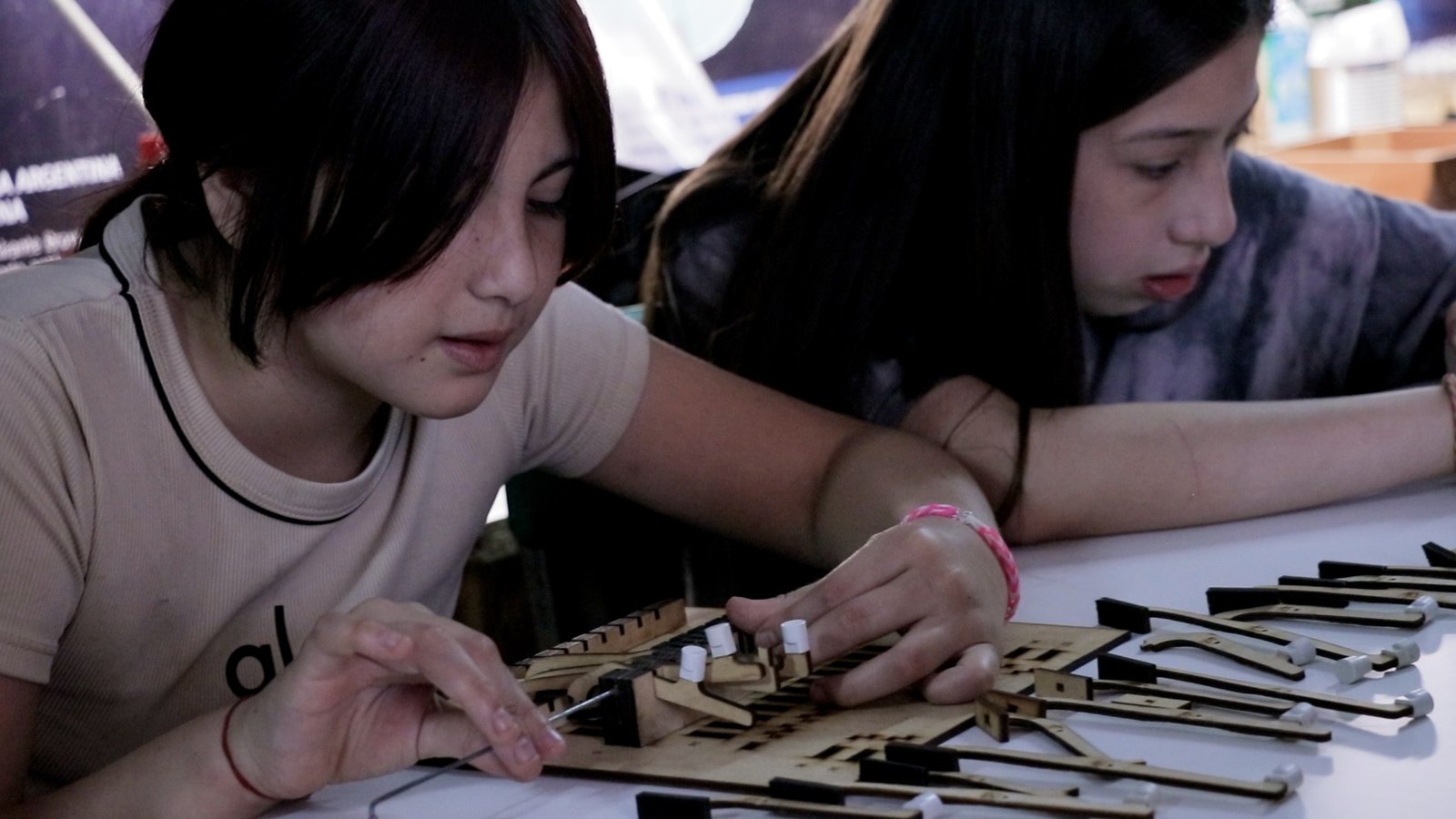 “Ahora van a tener su primera experiencia como luthiers”, anunció Humar al iniciar la actividad práctica. Divididos en grupos, los chicos desmontaron y volvieron a armar el sistema de palancas utilizando elementos simples. “No usamos cosas raras: hay rayos de bicicleta, piezas numeradas. La idea es mostrar que se puede”, subrayó.