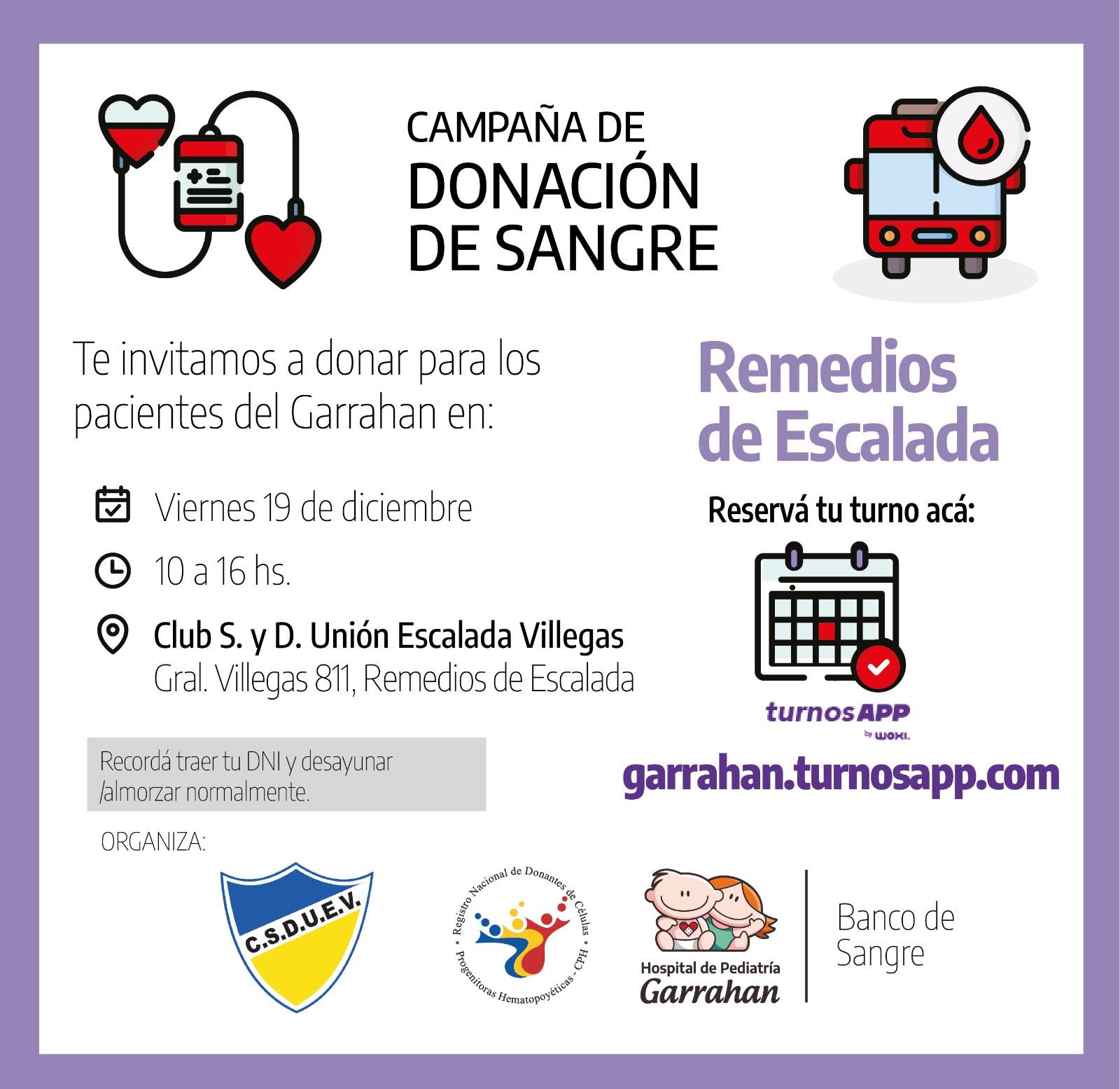 El Banco de Sangre del Hospital Garrahan llevará a cabo una campaña de donación de sangre en la localidad de Remedios de Escalada, con el objetivo de acercar la oportunidad de donar a la comunidad y asegurar la disponibilidad de hemocomponentes para los tratamientos de alta complejidad que reciben los pacientes pediátricos.