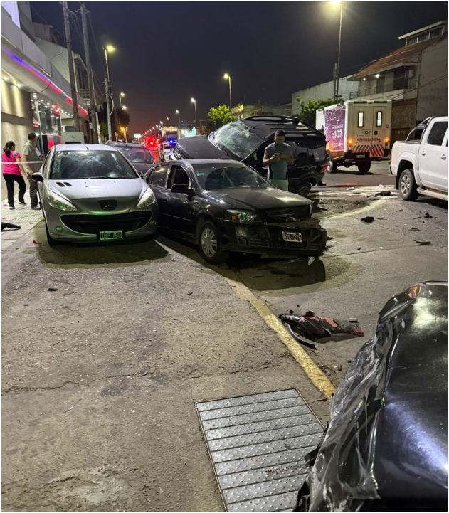 Producto de la violencia del impacto, ambos vehículos salieron despedidos y terminaron chocando a otros cinco autos que se encontraban detenidos en el semáforo de la mano contraria (dirección norte). Entre los damnificados se encuentran conductores de entre 28 y 63 años, incluyendo a otro efectivo policial que manejaba un Chevrolet Agile.
