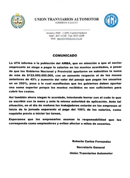 «Esperamos que los empresarios asuman la responsabilidad que les corresponde como empleadores y eviten afectar a miles de usuarios», cierra el comunicado, que lleva la firma del secretario General, Roberto Carlos Fernández.